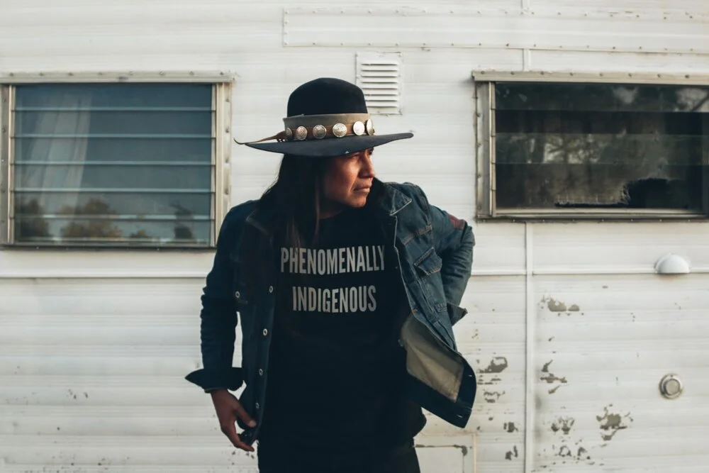 Sanchez is a jewelry maker and artist who creates pieces that reflect his Diné and Apache heritage. Lehi started his company after realizing the damaging effects of fast fashion and how things are wasted and damaged along the way. He set out with a desire to clothe people in dignity and reclaim what already exists into something beautiful. Over the years he collected materials, leathers, old vintage shirts, and coins. These tattered and second-hand elements are curated to make the vast aesthetic array of ThunderVoice Eagle Co. hats, jewelry, and apparel.